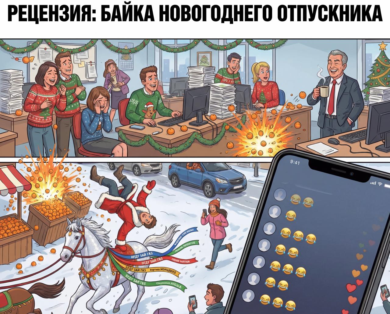 Композиционно рассказ двигается от бытового к сказочному очень органично. Первый пласт – это офисная сатира о том, как корпоративная машина заставляет людей плясать под KPI даже накануне праздника. Второй пласт – это настоящий новогодний разгон в сторону фантасмагории с конезаводом, табуном, прямым эфиром и площадью с ёлкой. Важно, что финальная «сказочность» не выглядит пришитой: она вырастает из самой логики современности, где любой случайный эпизод может стать контентом, а контент вдруг становится судьбоносным. И при этом в тексте остаётся тепло, ощущение большого общего праздника, когда люди на секунду перестают быть конкурентами.